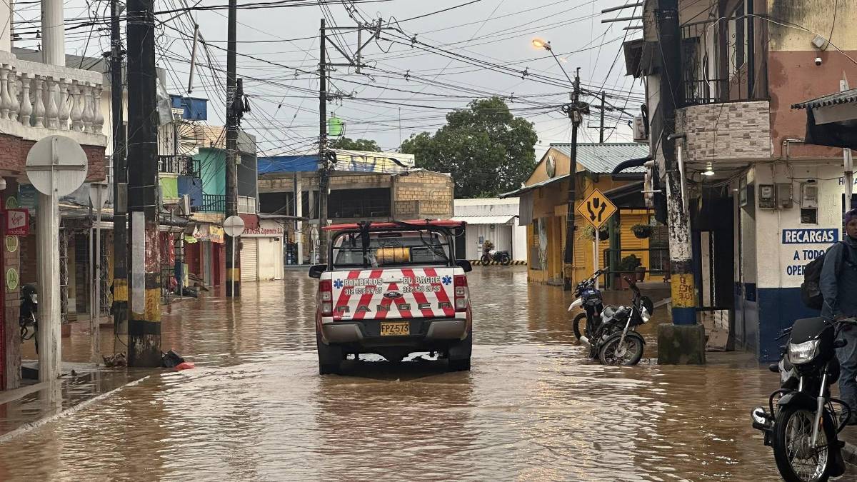 • Una unidad de los bomberos recorre las inundadas calles de El Bagre. FOTO: imagen tomada de redes.