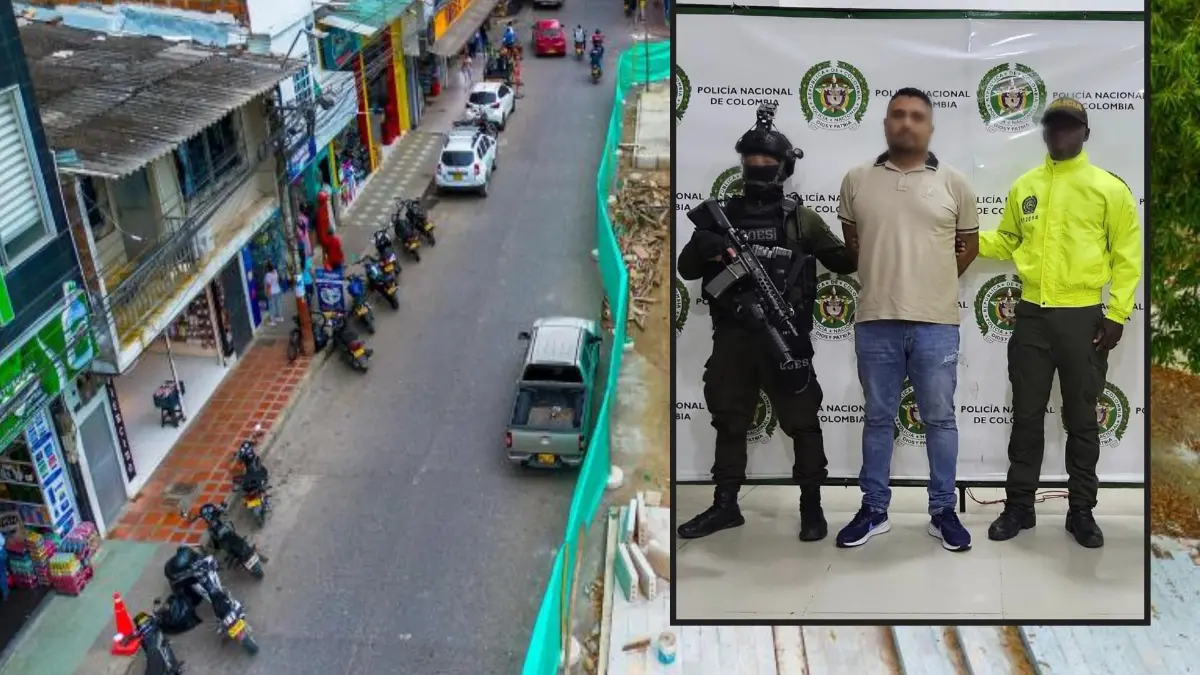 Adelante, una de las calles del municipio de Apartadó, donde se dio la captura. Atrás, el señalado jefe financiero. FOTO: Andrés Camilo Suárez Echeverry y Cortesía Policía Urabá