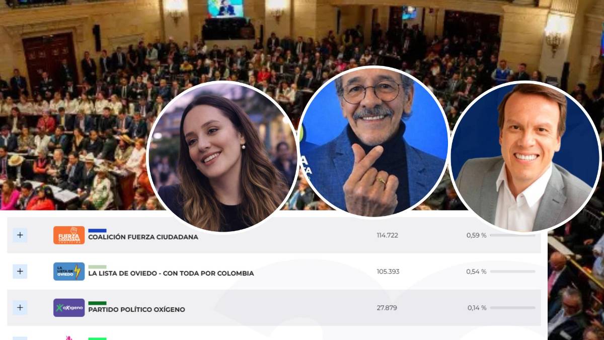 Entre las listas con menor votación aparece la Coalición Fuerza Ciudadana, que obtuvo 114.722 votos (0,59 %). Le sigue La lista de Oviedo – Con Toda por Colombia, que alcanzó 105.393 votos (0,54 %). Por su parte, el Partido Político Oxígeno sumó 27.879 votos (0,14 %). Aún más abajo se ubican Patriotas con 10.755 votos (0,05 %) y Colombia Segura y Próspera con 10.754 votos (0,05 %) del total reportado en los boletines preliminares.