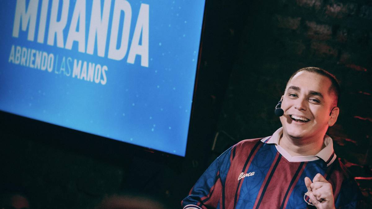 Miranda nació hace 30 años con parálisis cerebral producto de una asfixia de 8 minutos durante el parto. De allí que tenga (ahora menos que antes) algunas discapacidades físicas: las manos rígidas —mientras en sus shows el público aplaude, él se choca los nudillos— y las piernas torpes: el primer chiste de su rutina es una burla a sí mismo por caminar como borracho mientras sube las escaleras hacia la tarima. Por eso sus compañeros de clase lo designaban como el árbitro de los partidos.