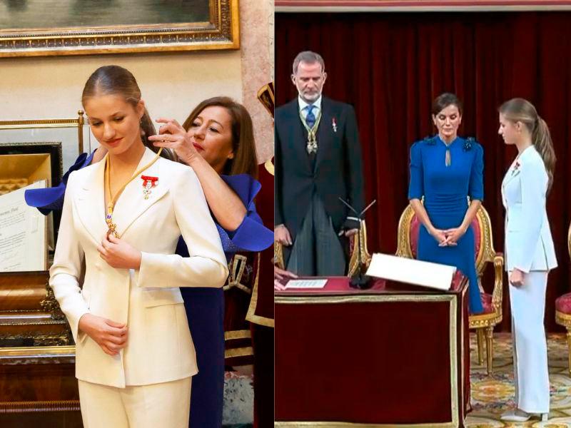 Leonor de Borbón, acompañada de su padre el rey, su madre la reina Letizia y su hermana la infanta Sofía, prestó juramento en una sesión especial de las Cortes, un trámite que cumplió su abuelo Juan Carlos I en 1969, durante la dictadura franquista, y Felipe VI en 1986, en democracia.
